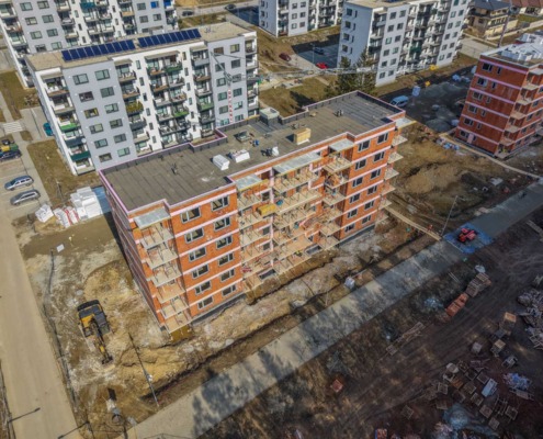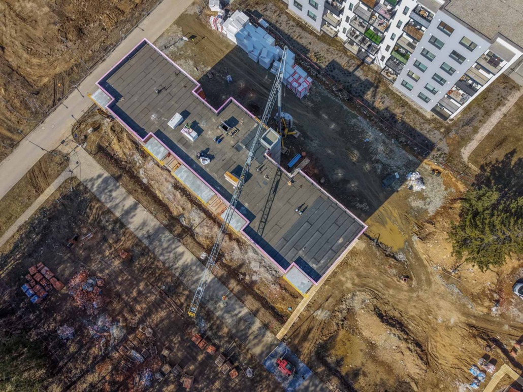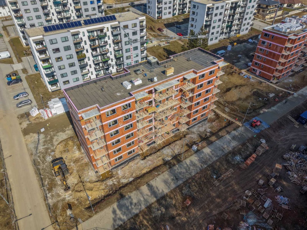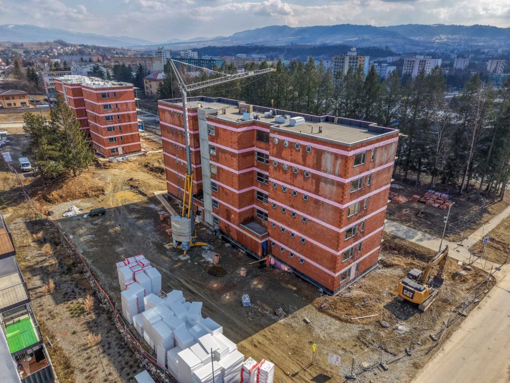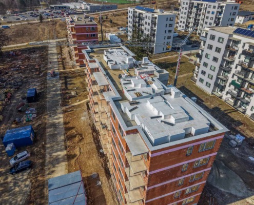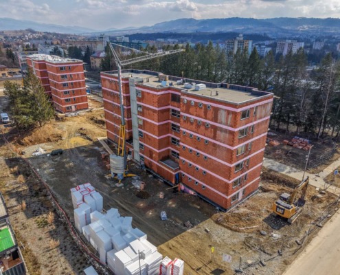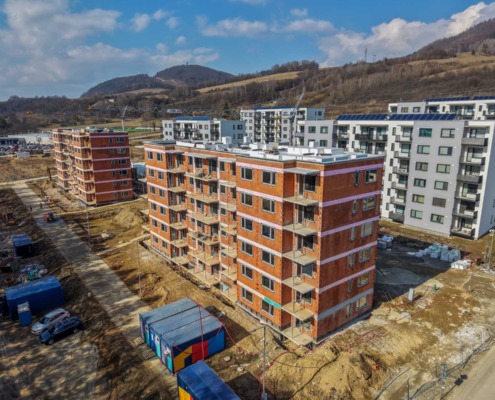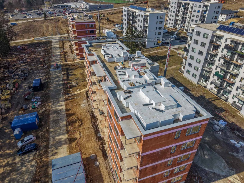 Výstavba pokračuje podľa plánu. Podlažia sú dokončené, pracujeme na fasáde a práce sa postupne presúvajú do interiérov.