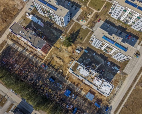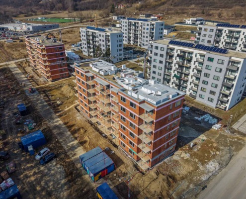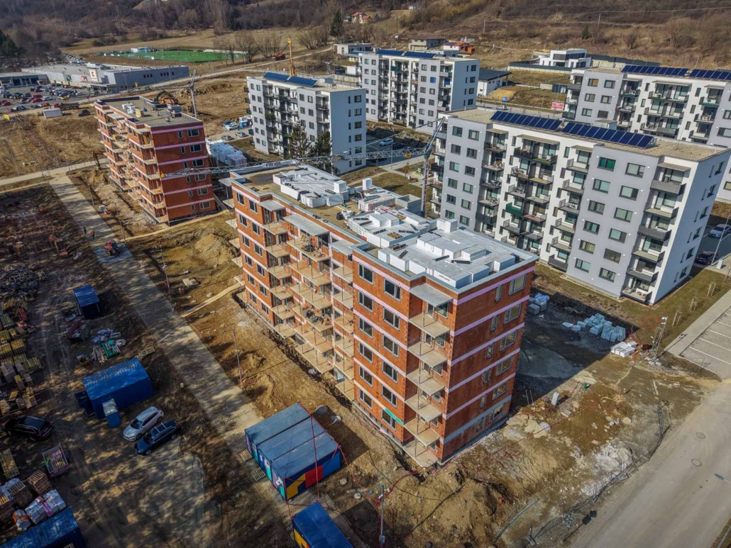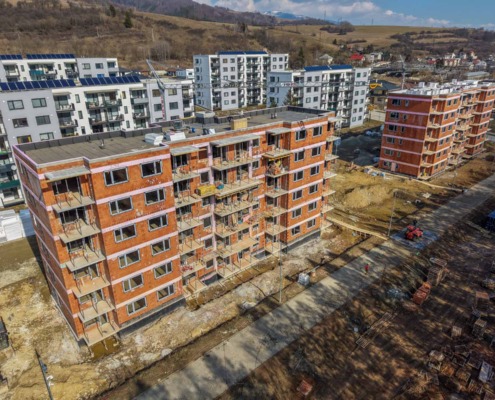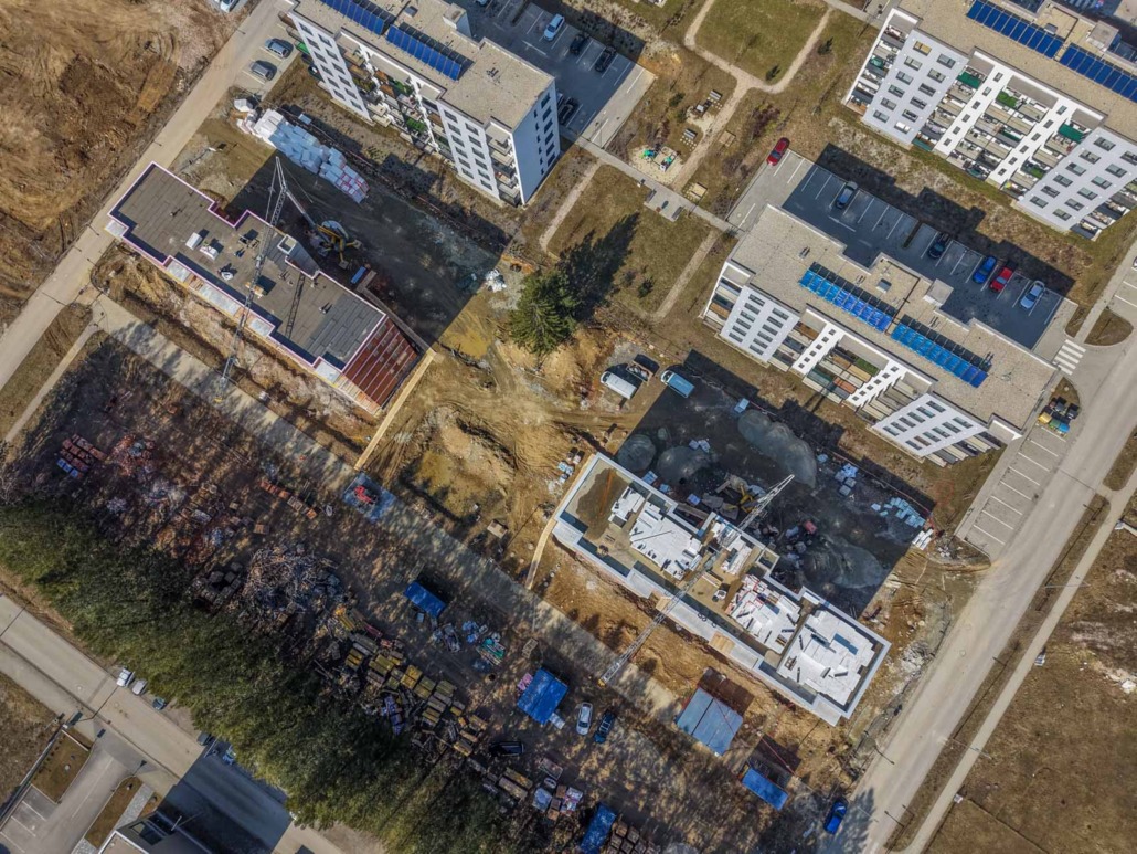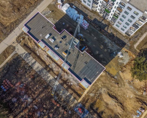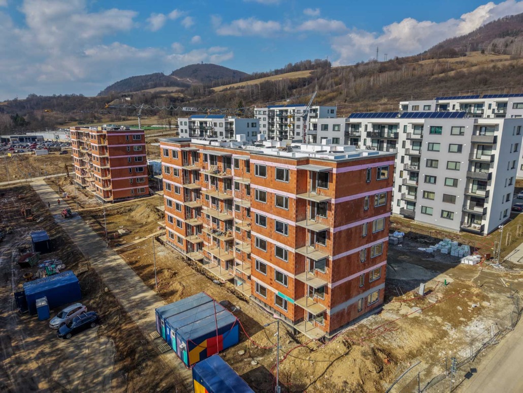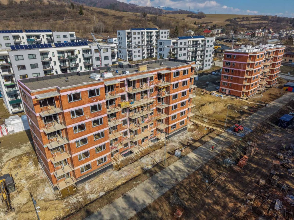 Výstavba pokračuje podľa plánu. Podlažia sú dokončené, pracujeme na fasáde a práce sa postupne presúvajú do interiérov.